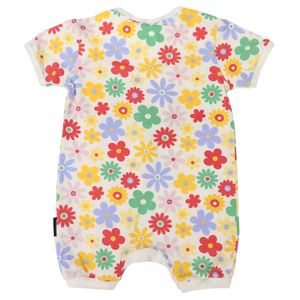 Brighten up her wardrobe with Korango's Flower Print Short Sleeve Zip Romper Cloud. Featuring a cream hue adorned with vibrant flowers and playful pink edging, this romper is as cute as it is comfortable. The easy-to-use YKK zipper ensures quick changes, perfect for active little ones. Dress her in the fun, colourful style she loves, and watch her light up every room!