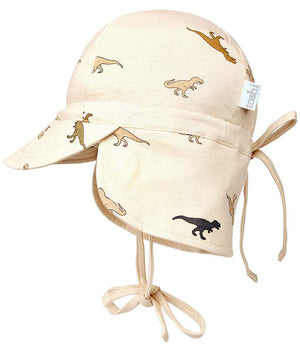 The Toshi Flap Cap Baby is our most popular baby sunhat. Shielding precious babies form the elements is the priority and our flap cap has a contoured neck flap for enhanced sun protection. A head tie creates adjustable sizing and the chin tie secures the cap. The cap is fully lined for increased comfort. Made from the finest quality cotton knit, the baby sunhat is gentle to wear, functional and practical. Flap Cap Baby Dinosauria  features a dinosaur print and ideal baby sunhat for fun in the sun.