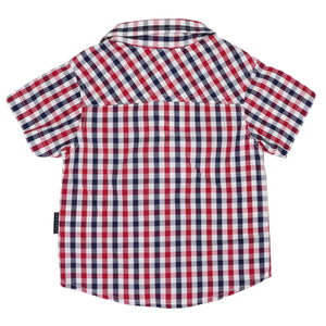 This smart short sleeved red check shirt by Korango makes the perfect addition to any little boys wardrobe. Perfect for any occasion with engraved wooden buttons for a modern touch.