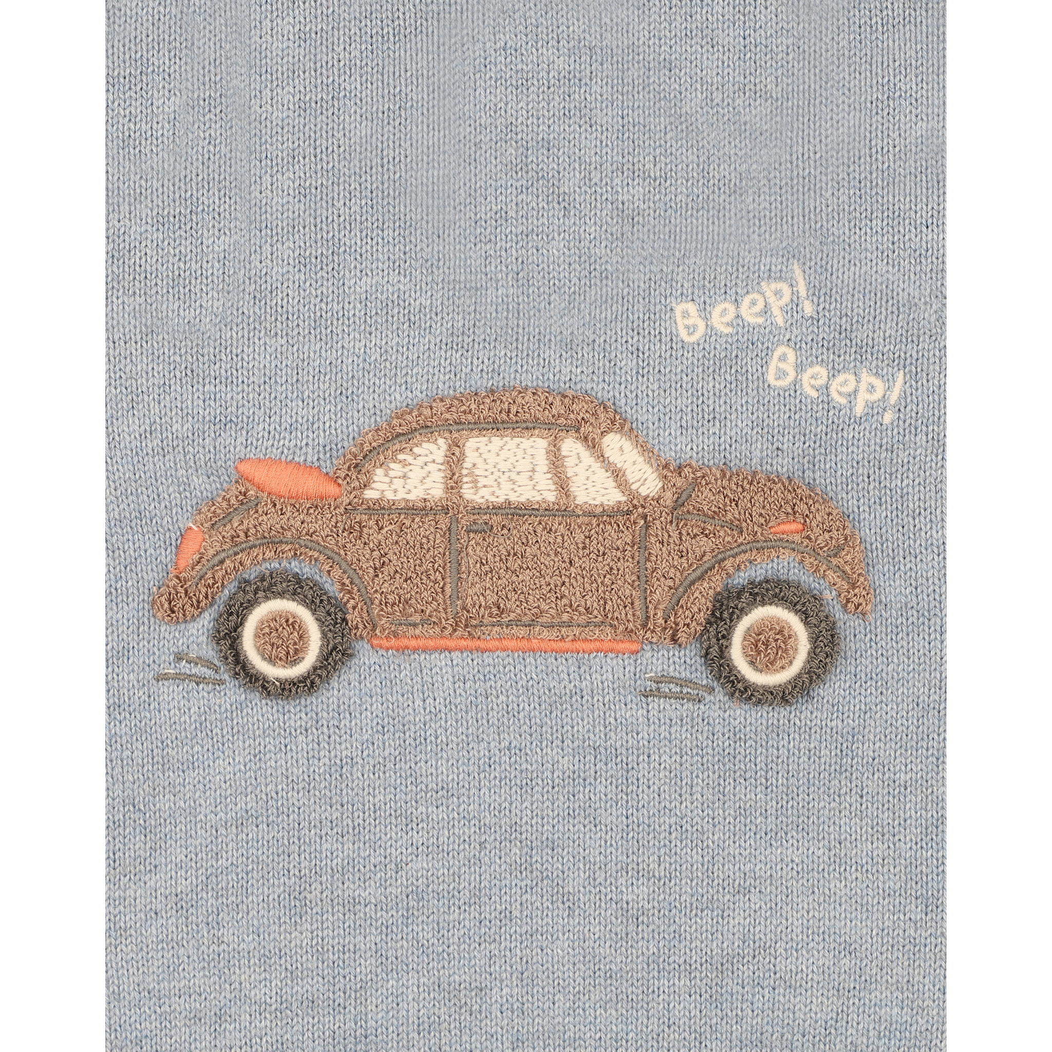 Embroidered vintage car motif with “Beep! Beep!” detail