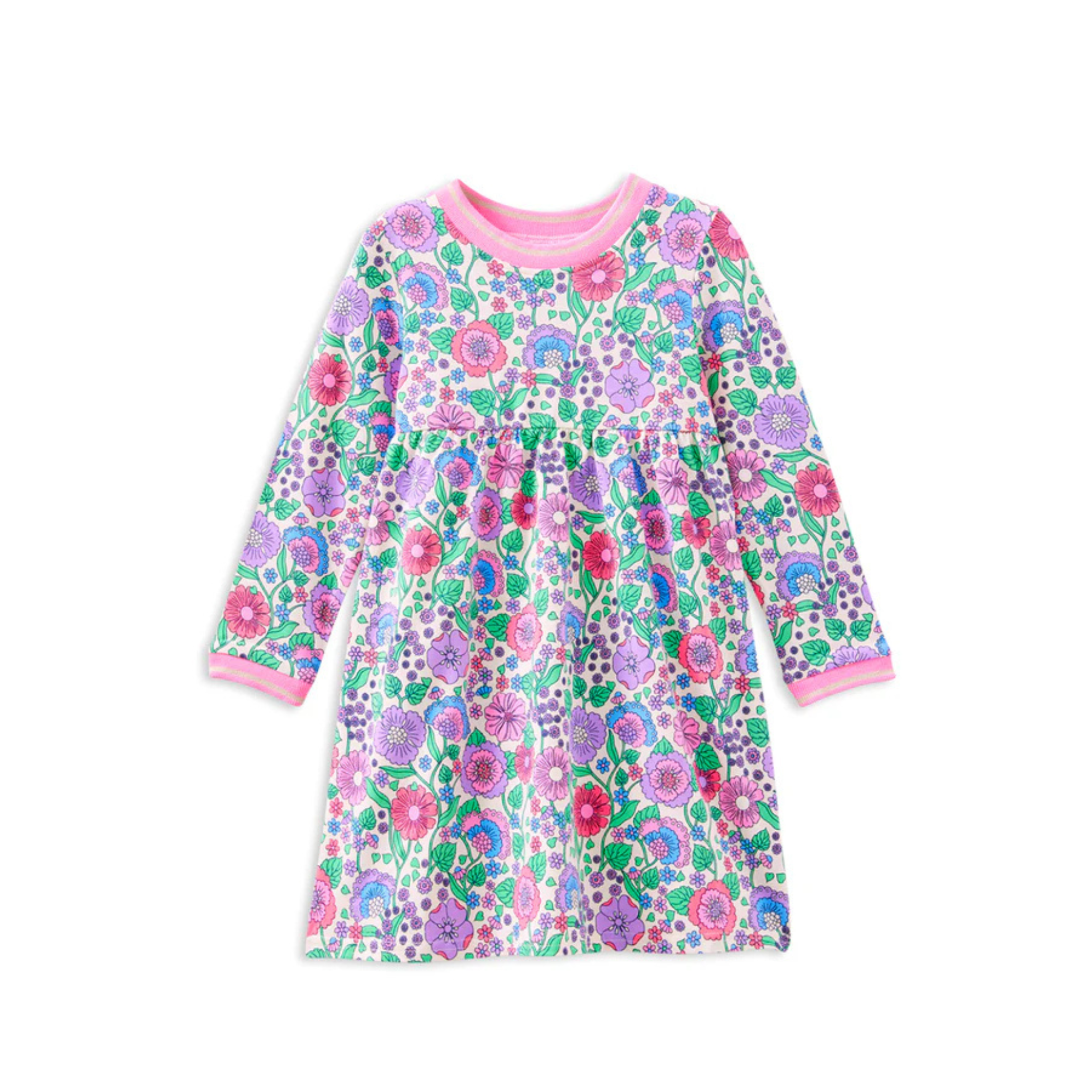Milky Clothing Confetti Garden Dress is the perfect everyday go-to for comfort and colour. Made from soft stretchy cotton jersey this easy-wear style features a cheerful floral print with pops of purple and pink. Finished with contrast rib binding in pink and cream at the round neckline and cuffs plus a gathered waist and straight hemline it’s ideal for daycare, playdates and weekend adventures. Just pull it on and go.