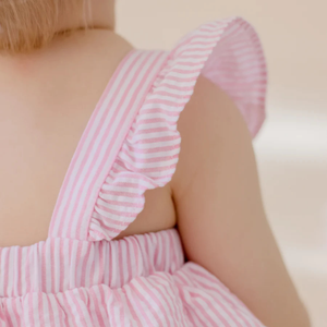 Bring on the sunshine in the Field of Berries Woven Frill Romper. Made from 100% cotton in a soft pink and white striped seersucker, it’s lightweight, breathable, and perfect for warm days. Frill details add a dainty touch, while press studs underneath make for quick, fuss-free changes.