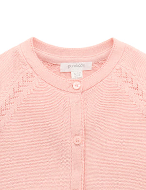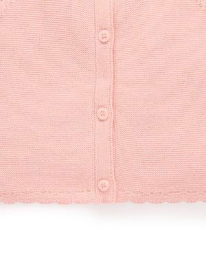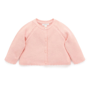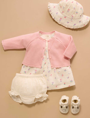 Scalloped Cardigan is the perfect layering piece to add to her transeasonal wardrobe. Lovely and soft, designed with a sweet scalloped hem. Made from 100% Organic Cotton, layer over our dresses or rompers for a cute outfit.